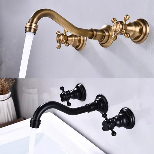 Wall Mounted Retro 3-Hole Double Cross Knob Brass Basin Mixing Faucet-7239